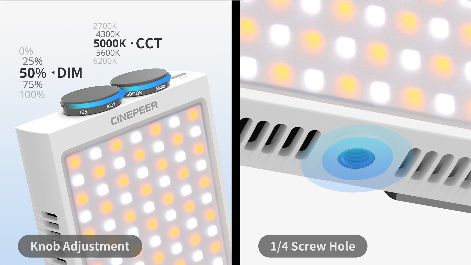 Simple Operation, Suitable for Everyone: Easy to control, ZHIYUN CM25 features two knobs—one for adjusting color temperature and the other for adjusting brightness—making it very easy to achieve the desired lighting effects.